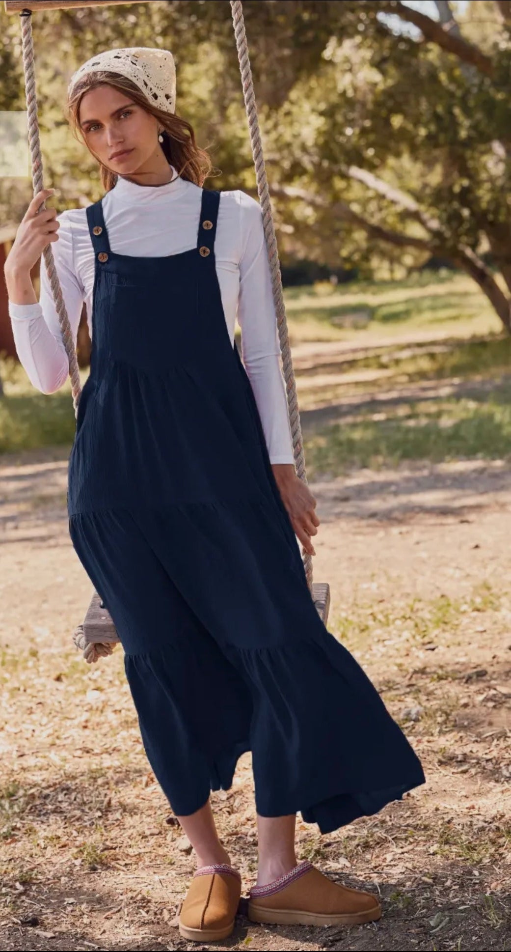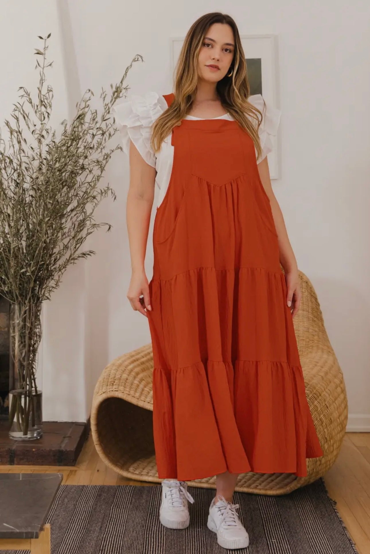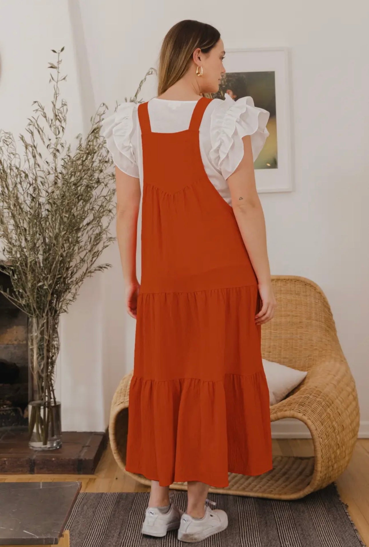 Solid button sling tiered midi dress with bust pocket and side pockets.